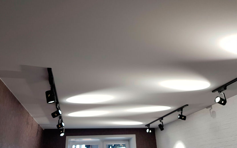 Заказать потолокТрековая система spot создана специально для встраивания в натяжные потолки, а благодаря тому что она использует демпферную систему крепления полотна, она подходит для ПВХ и тканевых натяжных потолков.